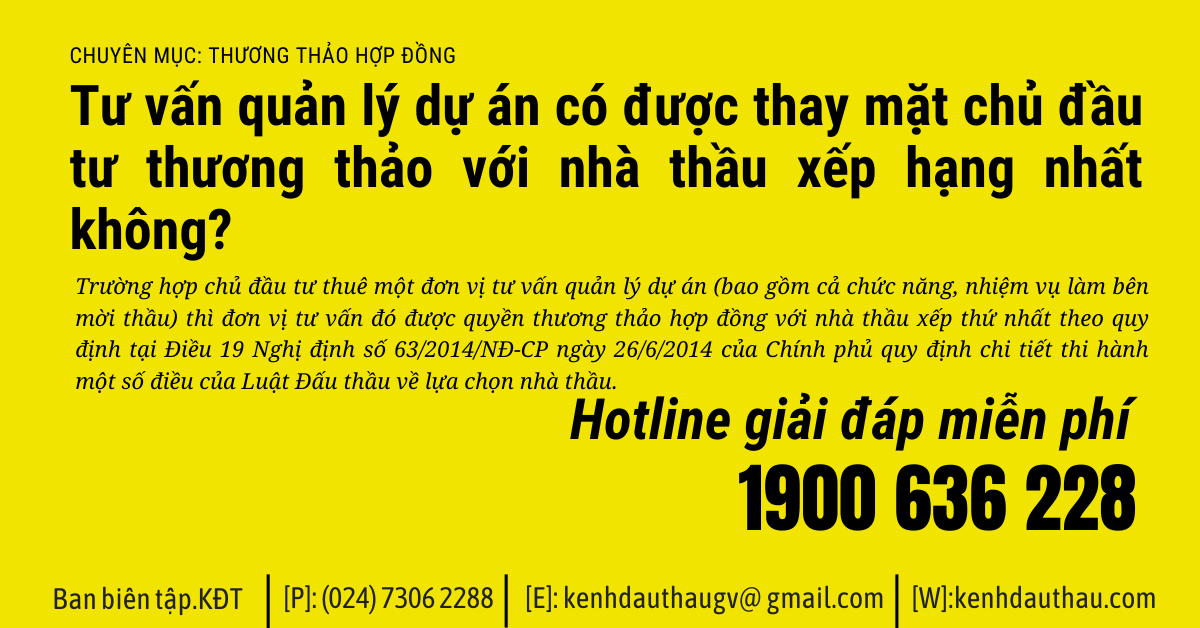 Trường hợp chủ đầu tư thuê một đơn vị tư vấn quản lý dự án (bao gồm cả chức năng, nhiệm vụ làm bên mời thầu) thì đơn vị tư vấn đó được quyền thương thảo hợp đồng với nhà thầu xếp thứ nhất theo quy định tại Điều 19 Nghị định số 63/2014/NĐ-CP ngày…