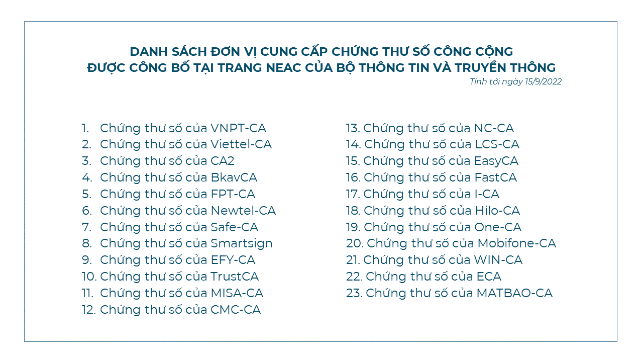 4. Chứng thư số công cộng (Chữ ký số doanh nghiệp): Phải sử dụng của một trong số 23 nhà cung cấp được hệ thống đấu thầu chấp thuận (có thể dùng chung với Chữ ký số mà bộ phận kế toán thường dùng để kê khai thuế, bảo hiểm).